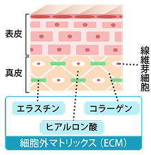 リズネに含まれるポリヌクレオチド(PN)は、肌の再生を担う線維芽細胞に働きかけます。これにより、コラーゲン・エラスチン・ヒアルロン酸の産生が促され、真皮層がふっくらと再構築されます。