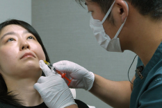 麻酔クリーム塗布後に医師がリズネを皮下に注入します。