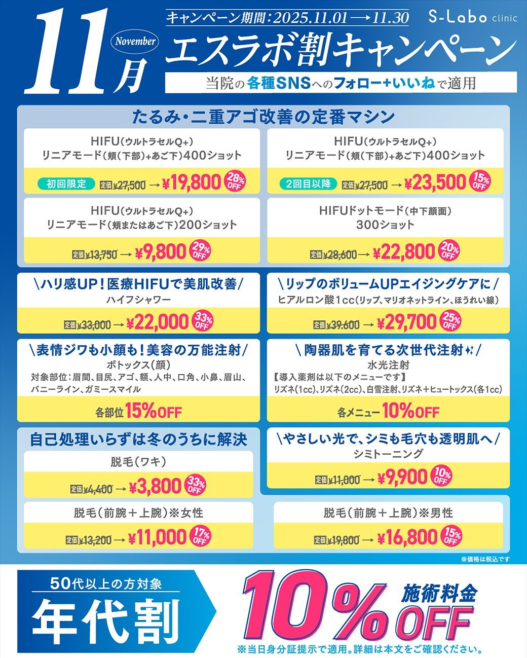 平素より、S-Laboクリニック渋谷院をご愛顧いただき、誠にありがとうございます。Laboクリニック渋谷院では、2025年11月1日(土)より「11月のエスラボ割キャンペーン」を実施いたします。たるみ・二重アゴの改善に効果的な「HIFU(ハイフ)治療」や表情ジワ改善と小顔効果も期待できる美容の万能注射「ボトックス」など、当院の人気メニューをお求めやすい価格で受けるチャンスです! …